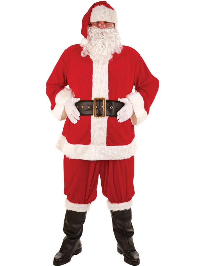 Tomtedräkt Deluxe inkluderar en röd tomterock med vit fluff samt ett par matchande byxor med resår vid midjan med fickor. Det ingår även ett rejält svart bälte i tyg med metallspänne, ett par vita handskar samt svarta skoöverdrag i läderimitation.