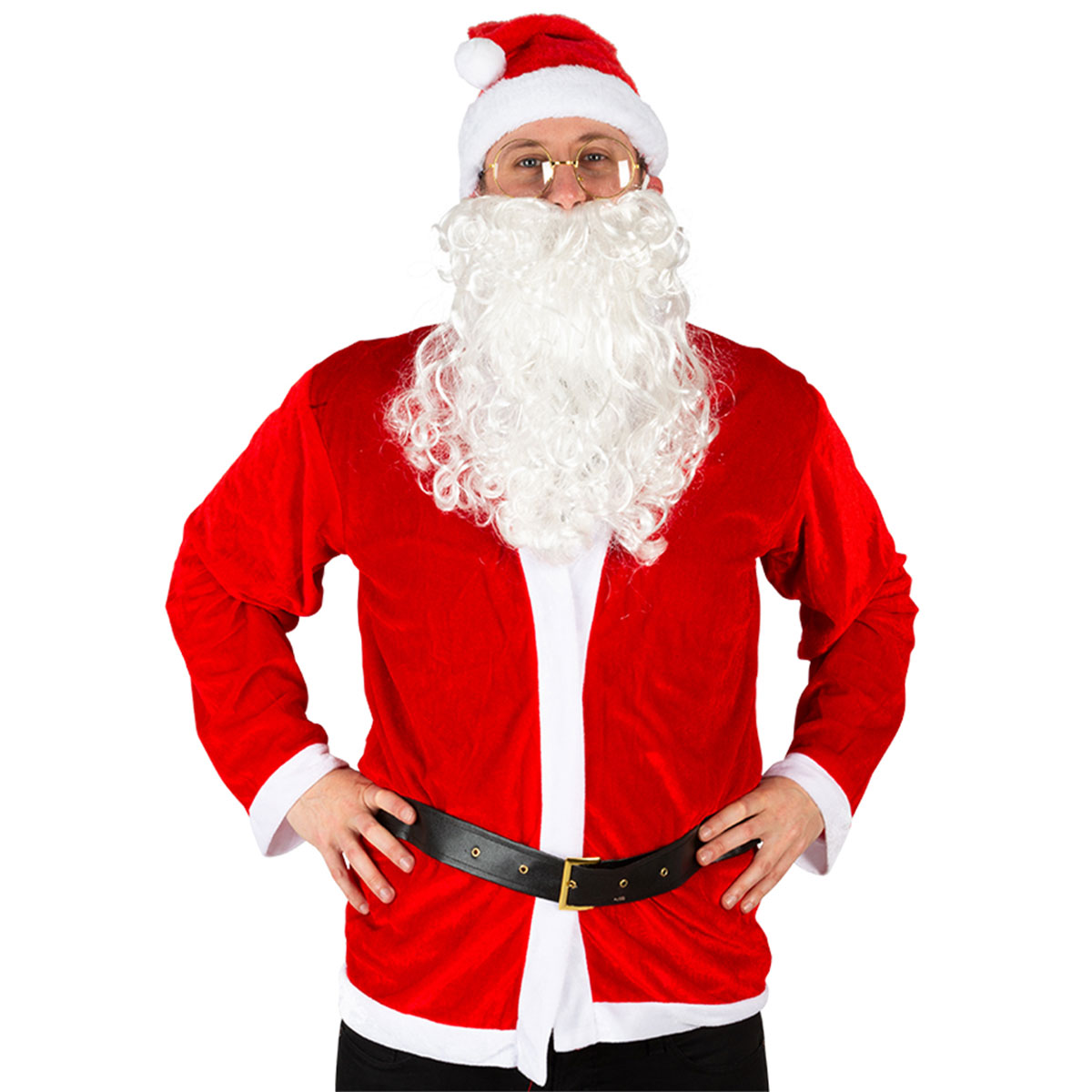 Tomtekit 4-pack omfattar ett tomtekit med en röd och vit tomteluva, ett vitt tomteskägg, ett svart bälte med guldigt spänne samt ett par runda glasögon med genomskinliga linser och silvriga bågar.