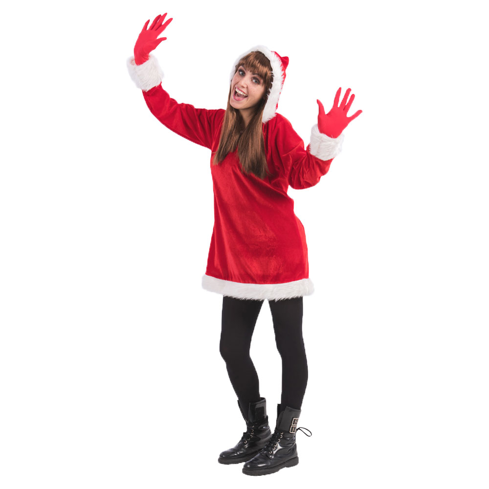 Tomteklänning med Huva omfattar en tomteklänning i röd sammetsliknande polyester med luva och vita, fluffiga kanter. Tomteklänningen är i vuxenstorlek.