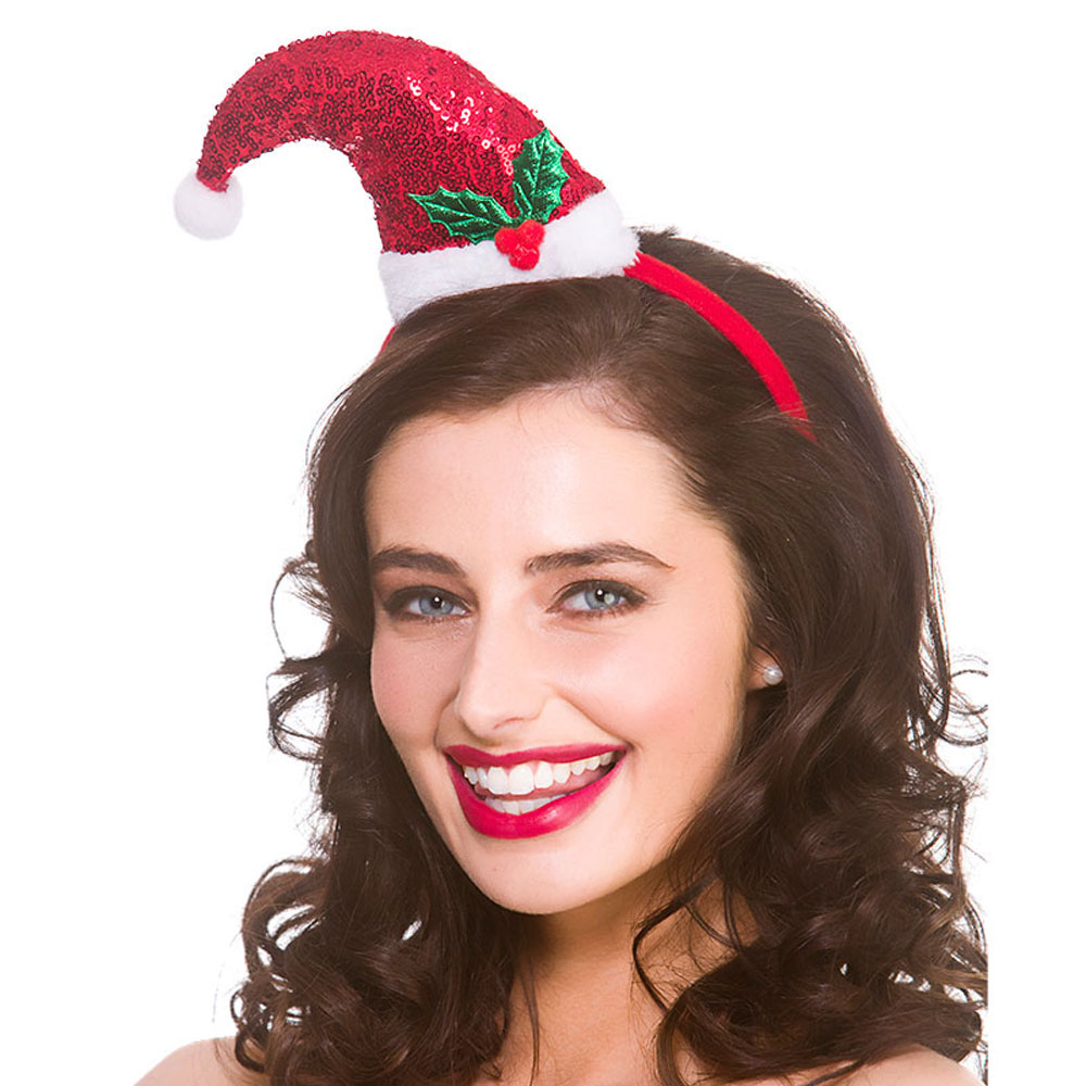 Tomteluva med Paljetter Diadem omfattar ett rött diadem med en liten röd-vit tomteluva på som pryds av röda paljetter och gröna järneksblad.
