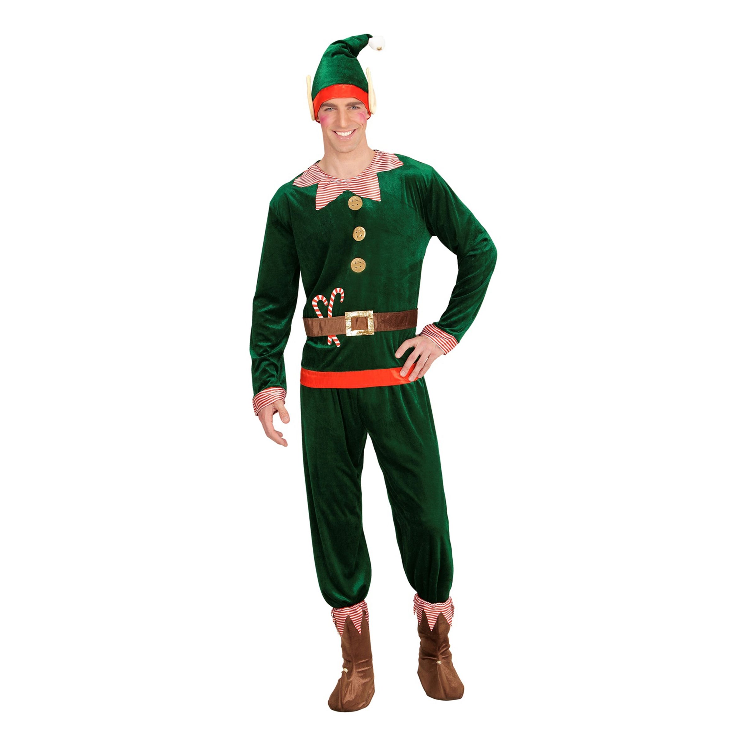 Tomtenisse Grön Maskeraddräkt består av en grön tröja med krage, mjuka knappar och fastsytt bälte samt motiv av två julkäppar. Medföljer gör ett par matchande byxor, ett par bruna skoöverdrag och en grön tomtenisseluva med stora elf-öron av plast.