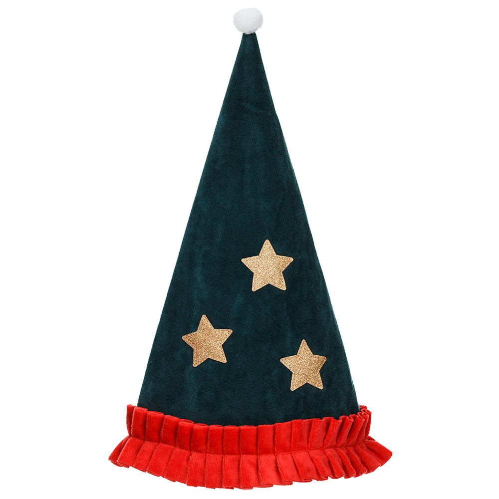 – En mörkgrön/röd mössa i form av kon med glittrande stjärnor