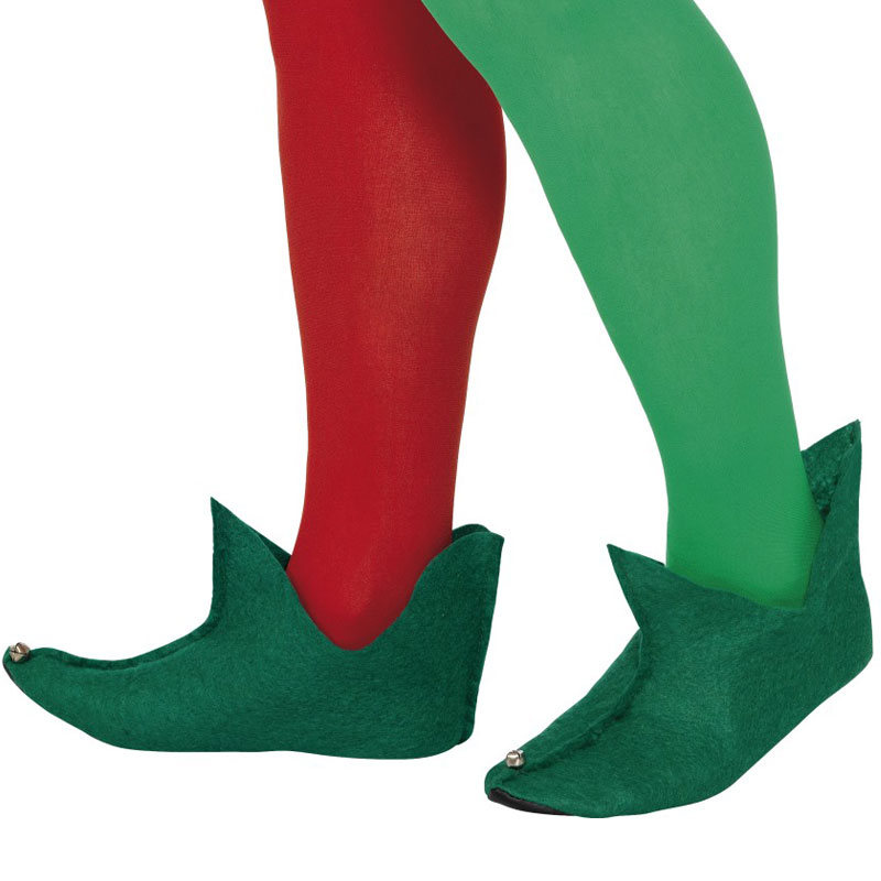 Tomtenisse Skor är tillverkade av grönt tygmaterial med svarta sulor och vardera bjällra framtill.