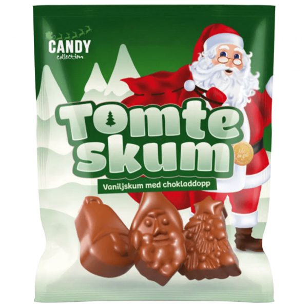 Tomteskum med Choklad omfattar en påse med skumgodis i olika julmotiv med smak av vanilj som är doppade i mjölkchoklad.