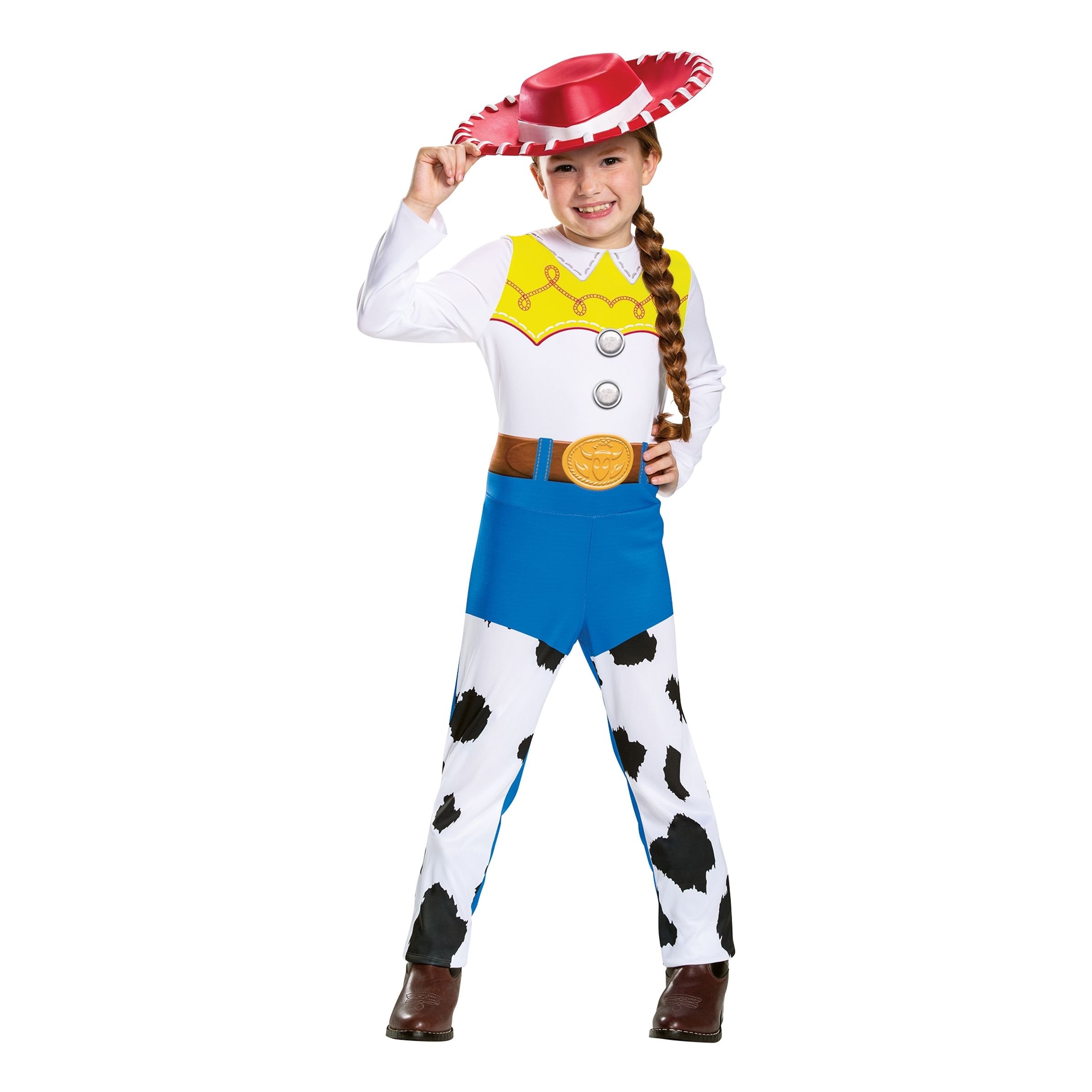 Toy Story Jessie Barn Maskeraddräkt inkluderar en tryckt overall med blå byxor med komönster på och ett brunt tryckt bälte i midjan. Överdelen är vit med gula detaljer. Det ingår även en röd hatt!
