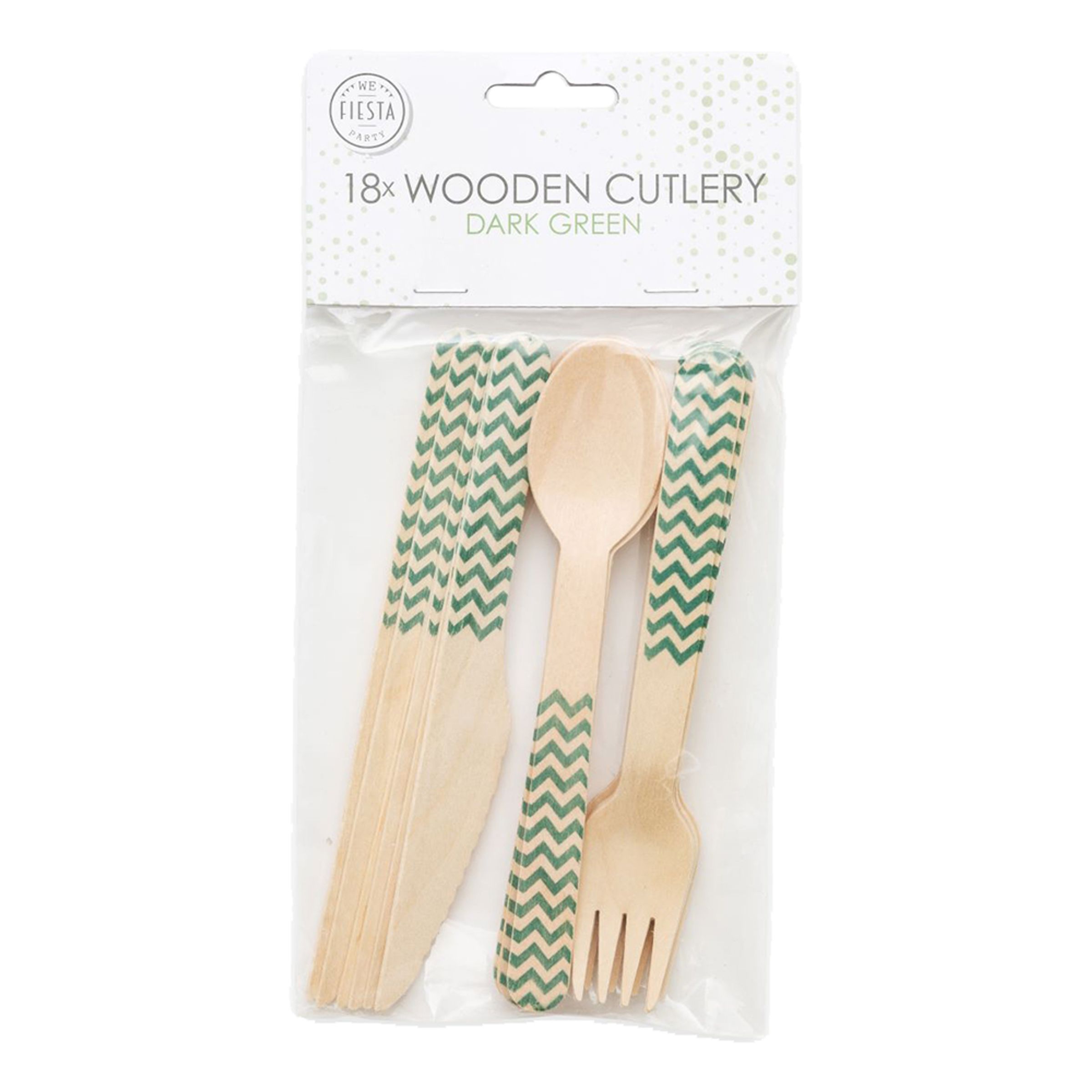 Träbestick Mörkgrönt Mönster innehåller 18 stycken bestick (6 skedar, 6 knivar, 6 gafflar) som alla är tillverkade i trä och pryds av en snyggt sicksackmönster. Besticken mäter ca 15 cm.