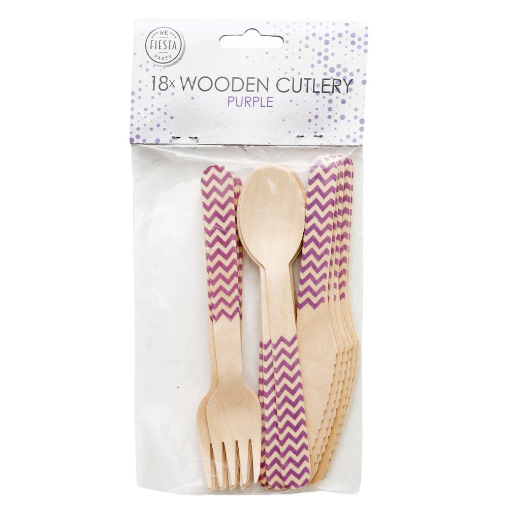 Med dessa träbestick med lila sicksack mönster blir det lätt som en plätt att duka upp kalasbordet! Festligt träbestick set med trägafflar, träknivar och träskedar som inte bara passar bra till fest och kalas utan också till picknicks och liknande. Det fina sicksackmönstret ger dem ett fint utseende och lämpar sig utmärkt till dukningar i lila. Toppen för alla som är ute efter snygga engångsbestick i trä!