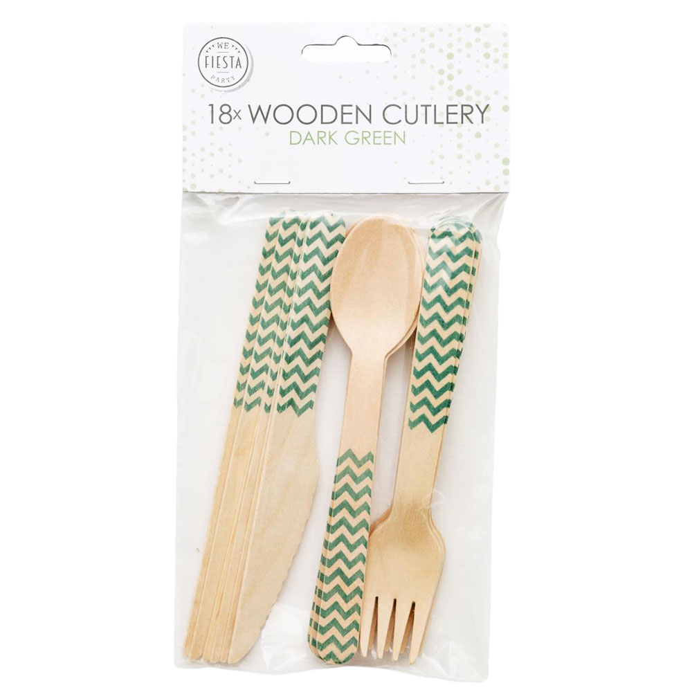 Skippa plasten och duka upp med engångsbestick av trä istället. Träbestick blir både snyggare och miljövänligare och passar utmärkt till flera olika festligheter. Just detta set med trägafflar, träknivar och träskedar kommer med ett snyggt sicksack mönster i mörkgrönt vilket gör dem extra fina. Superbra för den som vill duka upp kalaset på ett enkelt, snyggt och lite miljövänligare sätt!