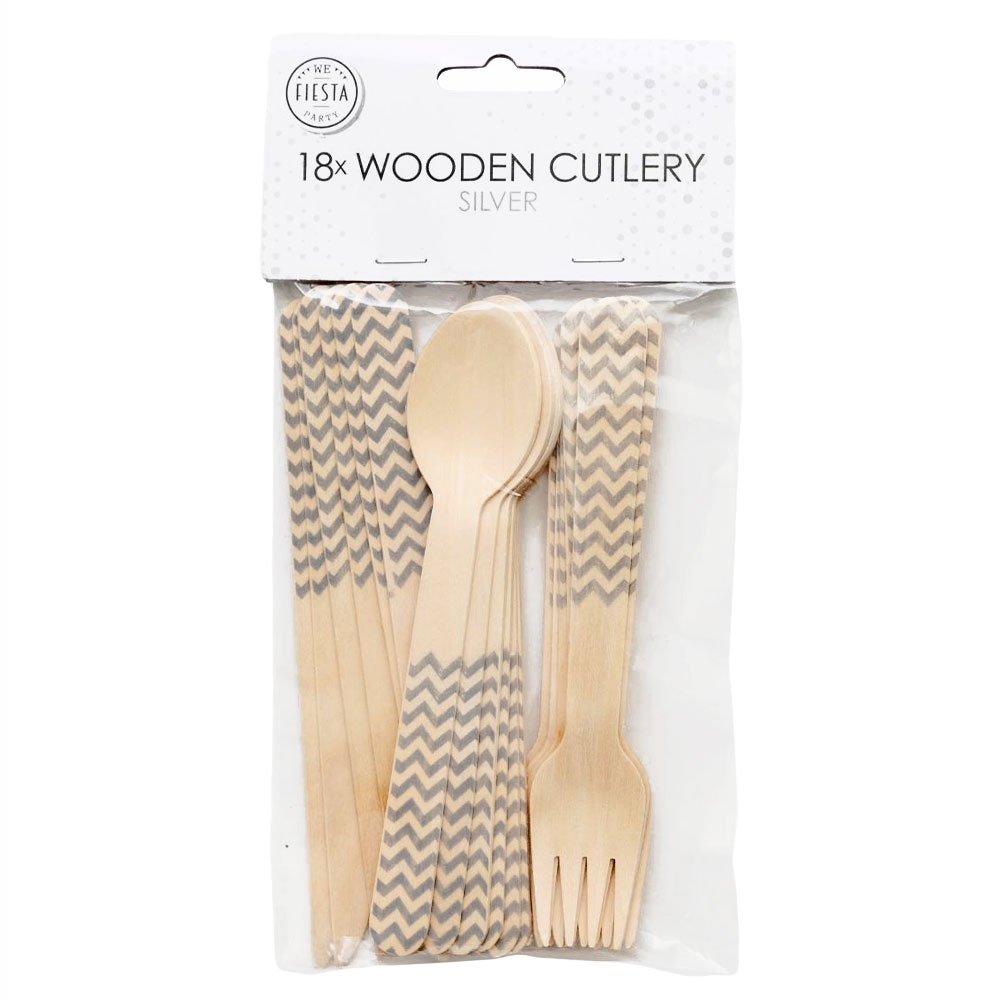 Träbestick Sicksack Silver omfattar ett 18-pack engångsbestick av trä med dekorativt sicksack mönster i silver. Besticken är ca 16 cm långa. Ett paket innehåller 6 st knivar, 6 st gafflar och 6 st skedar.