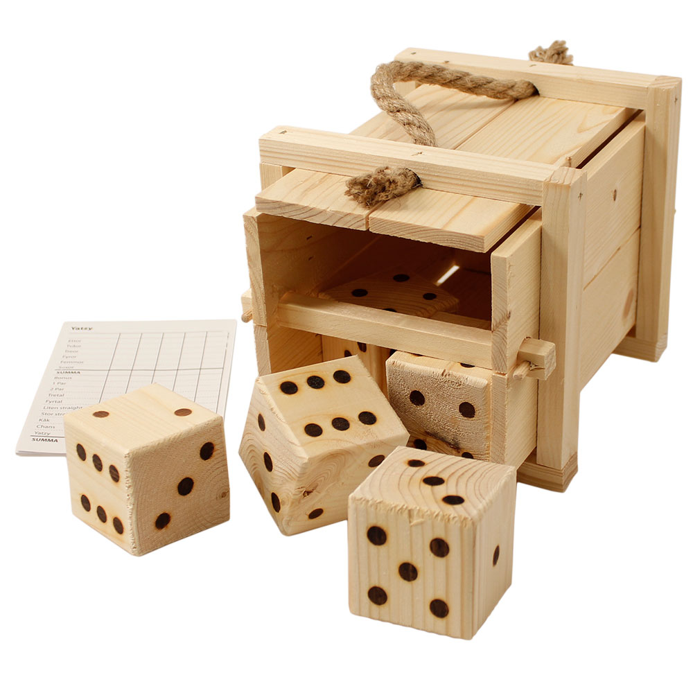 Trädgårds Yatzy Spel omfattar ett spel i trä med fem stora tärningar, en trälåda med rep och ett poängblock. Spelet går ut på att slå tärningarna och försöka få olika tärningskombinationer för att samla poäng. Den spelare som samlar mest poäng vinner.