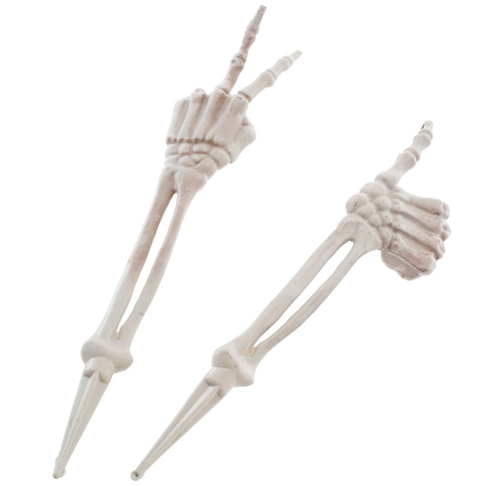 Trädgårdsdekoration Skelettarm omfattar en trädgårdsdekoration i form av en vit skelettarm med antingen tummen upp eller med fredstecken. Dekorationen har ett plastspjut som kan stickas ner i gräsmattan.