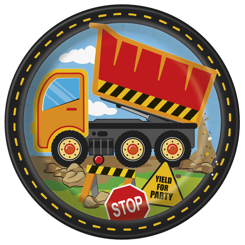 Traktor Tallrikar innehåller 8 stycken engångstallrikar med motiv av en dumper på en arbetsplats samt två skyltar med texterna "Stop" och "Yield For Party". Tallrikarna är tillverkade i papp.