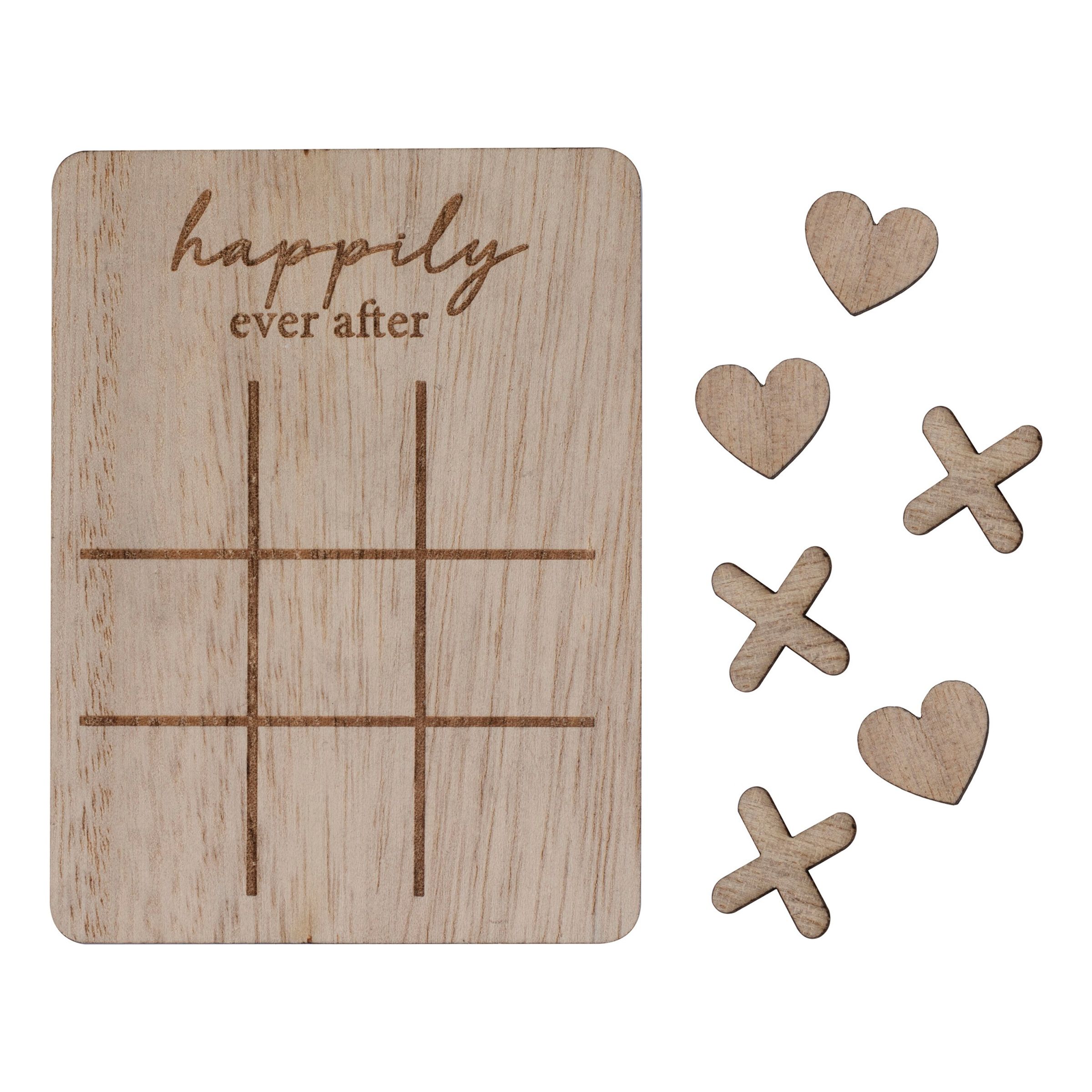 Tre i Rad Spel Bröllop inkluderar fem stycken miniatyrspel av tre i rad som det står ingraverat "Happily Ever After" på. Det följer även med matchande kors och hjärtan som spelpjäser. En rolig detalj att duka upp med på bröllopet!