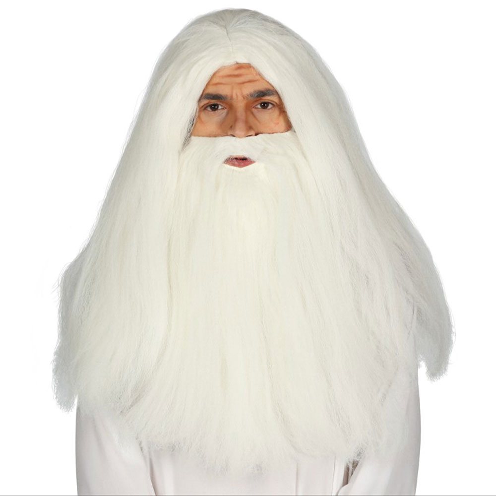 Trollkarlsperuk med Skägg omfattar en lång vit peruk med tillhörande långt vitt skägg som har ett hål över munnen.
