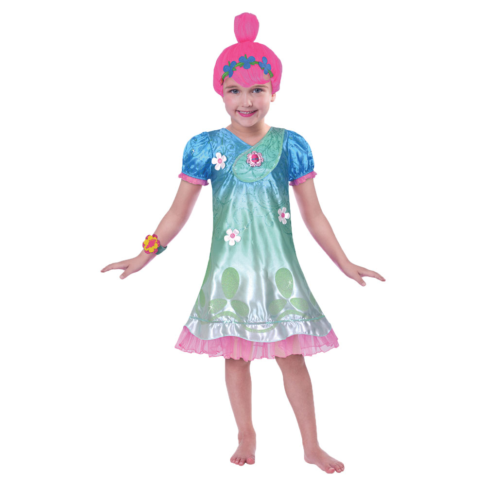 Trolls Poppy Utklädnad Barn omfattar en maskeraddräkt av polyester för barn i form av Trolls karaktären Poppy. Dräkten består av en blå-grön klänning med blommor och rosa volanger, en rosa Poppy peruk med hårband samt ett blommigt armband i olika färger.