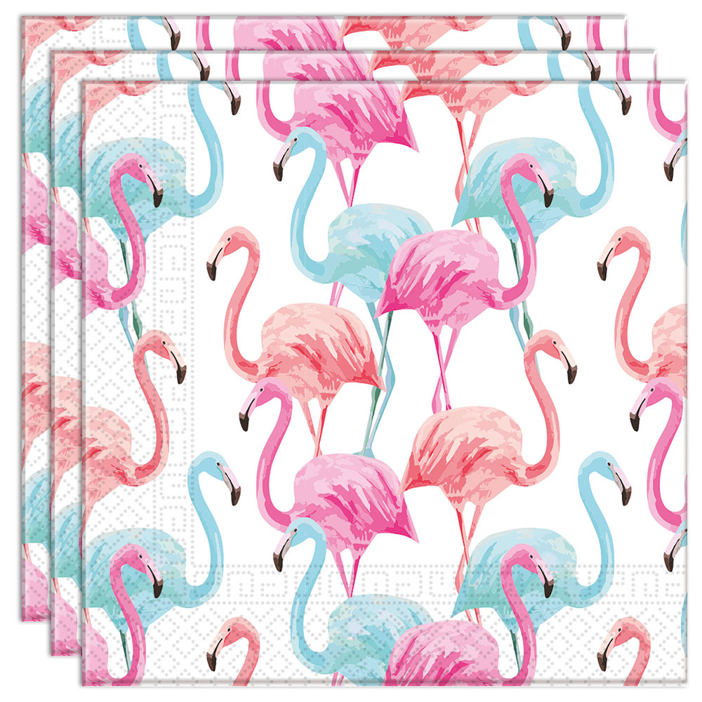 Tropical Flamingo Servetter omfattar ett 20-pack vita servetter med flamingo motiv i blått och rosa. Servetterna har två lager och mäter 33 x 33 cm utvikta.