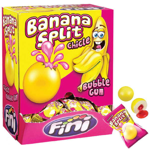 Tuggummi Banana Split omfattar ett runt tuggummi med banansmak med flytande jordgubbsfyllning.