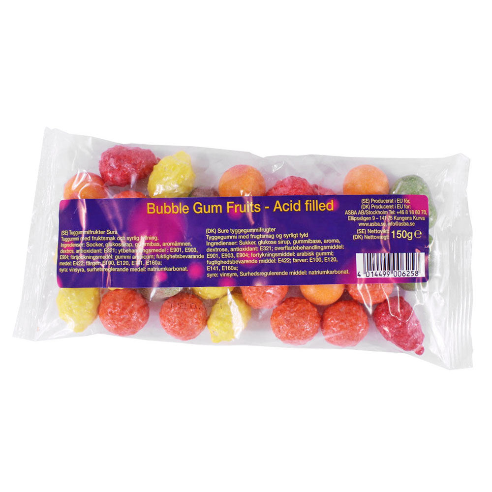Tuggummi Frukter Sura omfattar tuggummin med fruktsmak och syrlig fyllning inuti. Tuggummina ser ut som olika sorters frukter i olika färger och smaker.