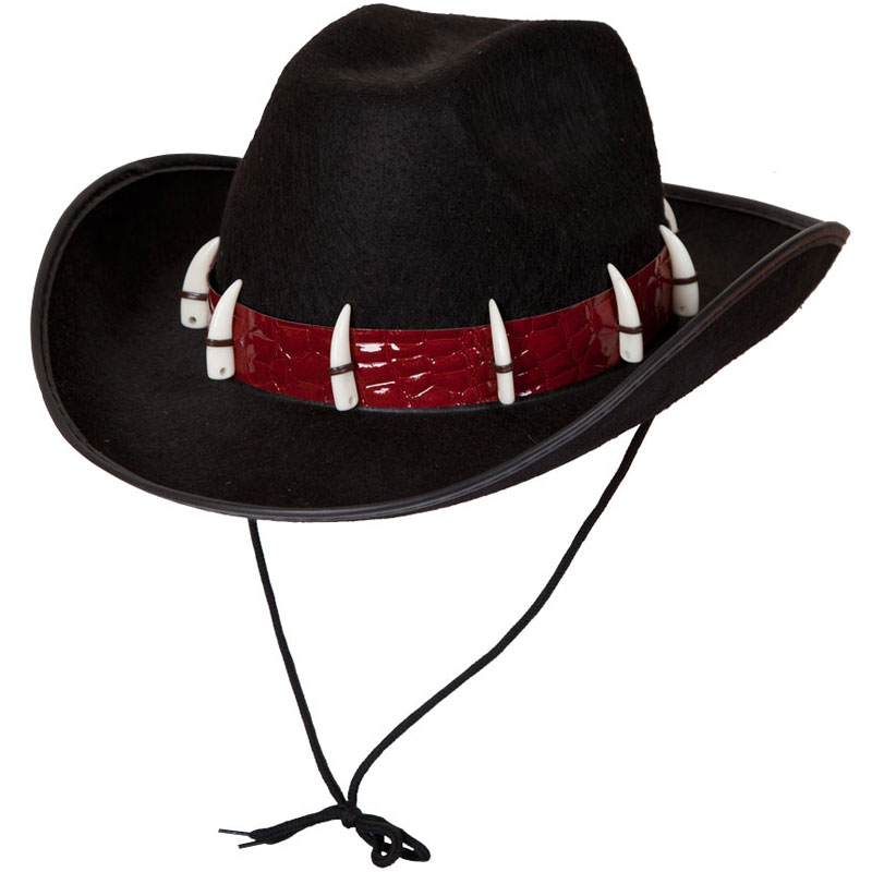 Bli årets snyggaste cowboy med denna fräcka cowboyhatt i svart med ormskinn och tänder, en westernhatt som är något utöver det vanliga och som passar perfekt till cowboy och vilda västern tema fest och kalas och varför inte Halloween maskerad. En annolrunda cowboy hatt som blir en perfekt utklädnad till årets skojigaste event.