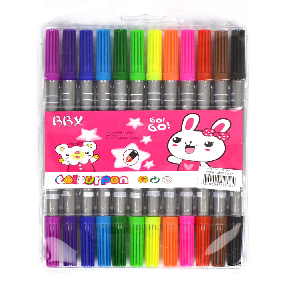 Tuschpennor i regnbågens alla färger för både stora och små konstnärer! Med de här fina tuschpennorna kan du enkelt addera härliga färger till alla dina teckningar. Pennorna har även dubbla uddar, en som är lite smalare som passar för små detaljer och en som är lite tjockare som passar bra till större ytor. Utmärkta pennor för alla som vill färglägga sina teckningar riktigt fint!