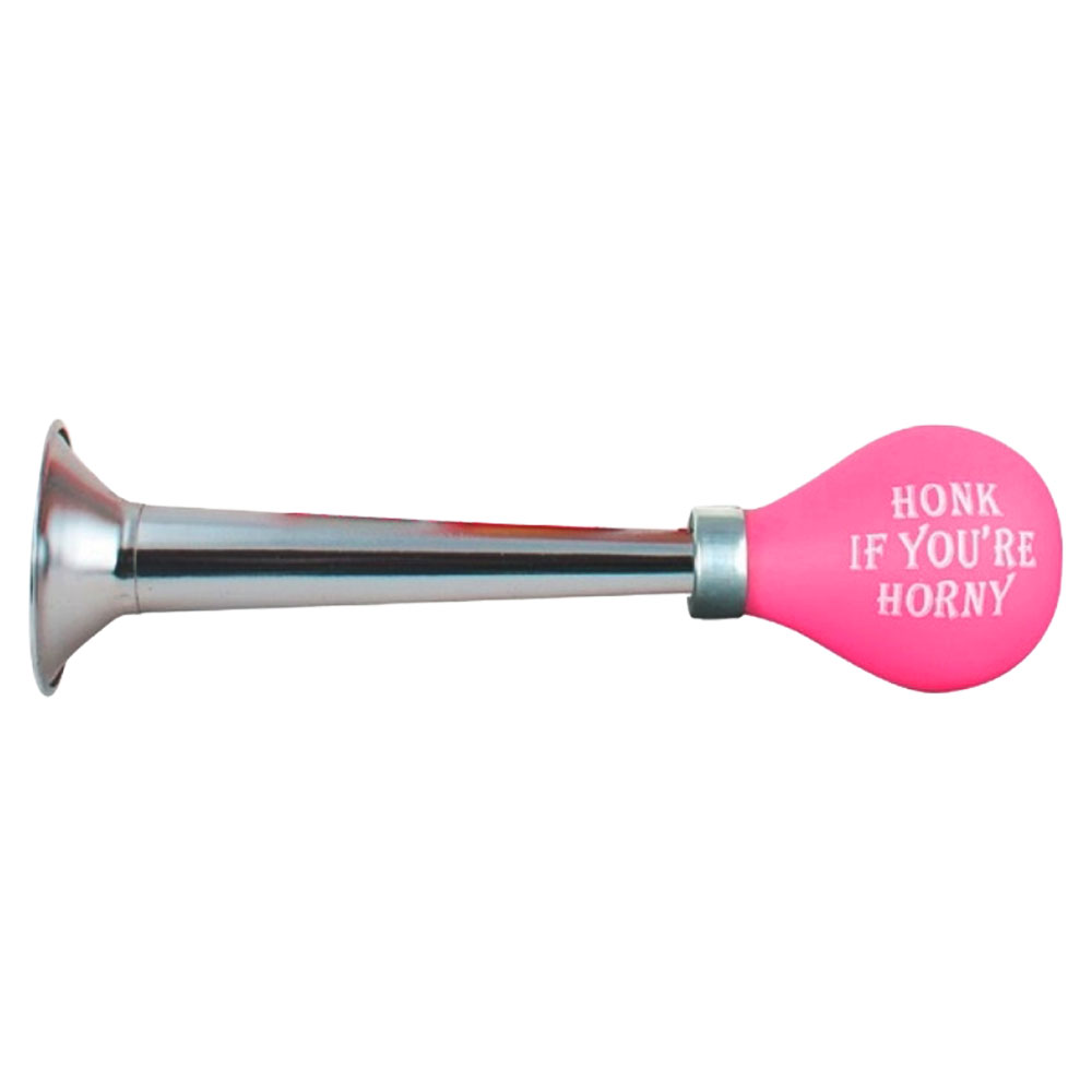 Tuta Honk If You're Horny omfattar en tuta i silver med rosa tuta och texten "Honk if you're horny" i vitt. Tutan är ca 20 cm lång och är tillverkad i plast och metall.