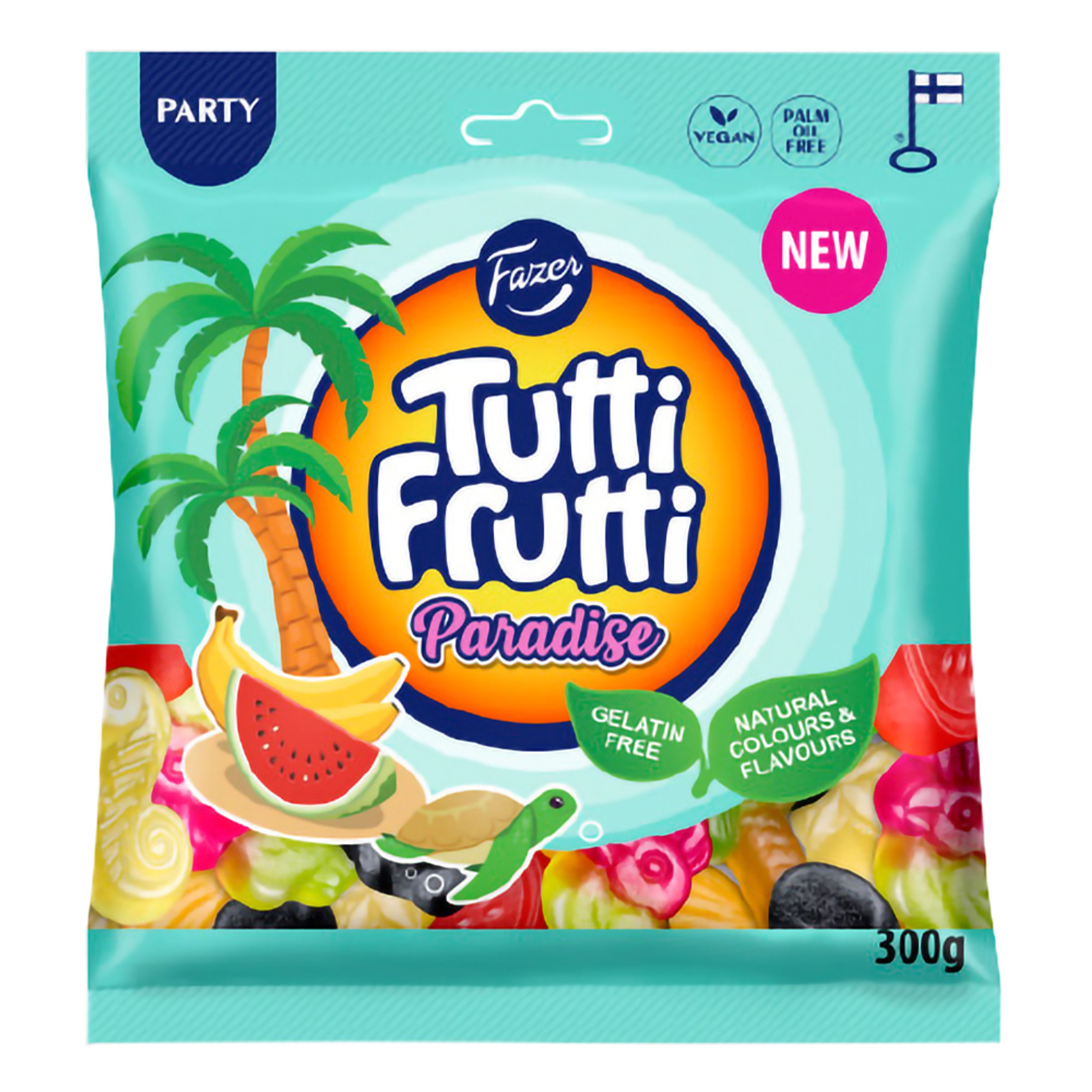Tutti Frutti Paradise Påse är gelégodis med exotiska fruktsmaker, krispig saltlakrits och sötlakrits. Fri från palmolja, gelatinfri och vegansk. Tillverkad med naturliga färg- och smakämnen.