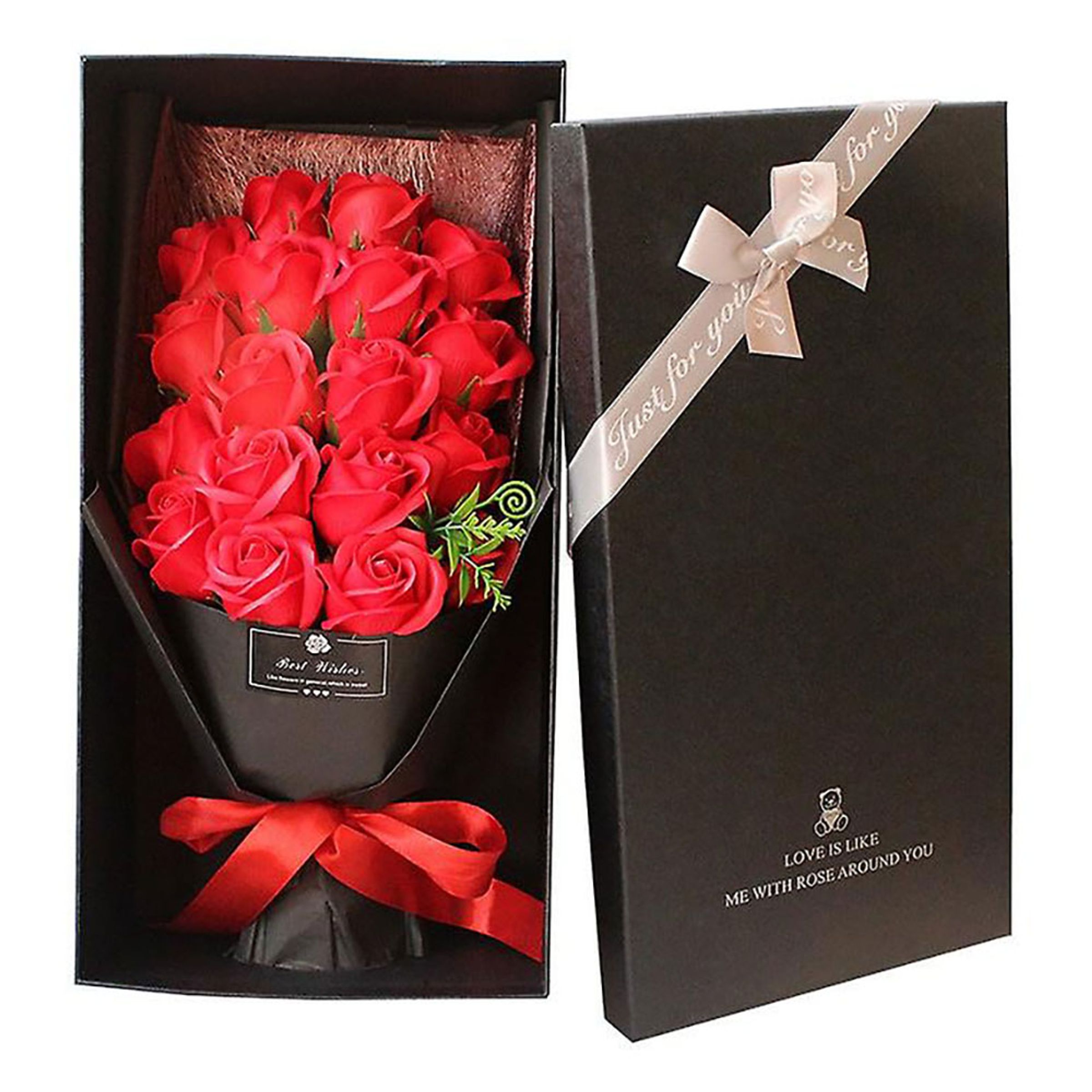Tvålrosor Bukett består av en vacker blombukett med 18 stycken handgjorda rosor av röd tvål. Rosorna levereras dessutom i en vacker presentbox som gör buketten till en alldeles utmärkt romantisk present!