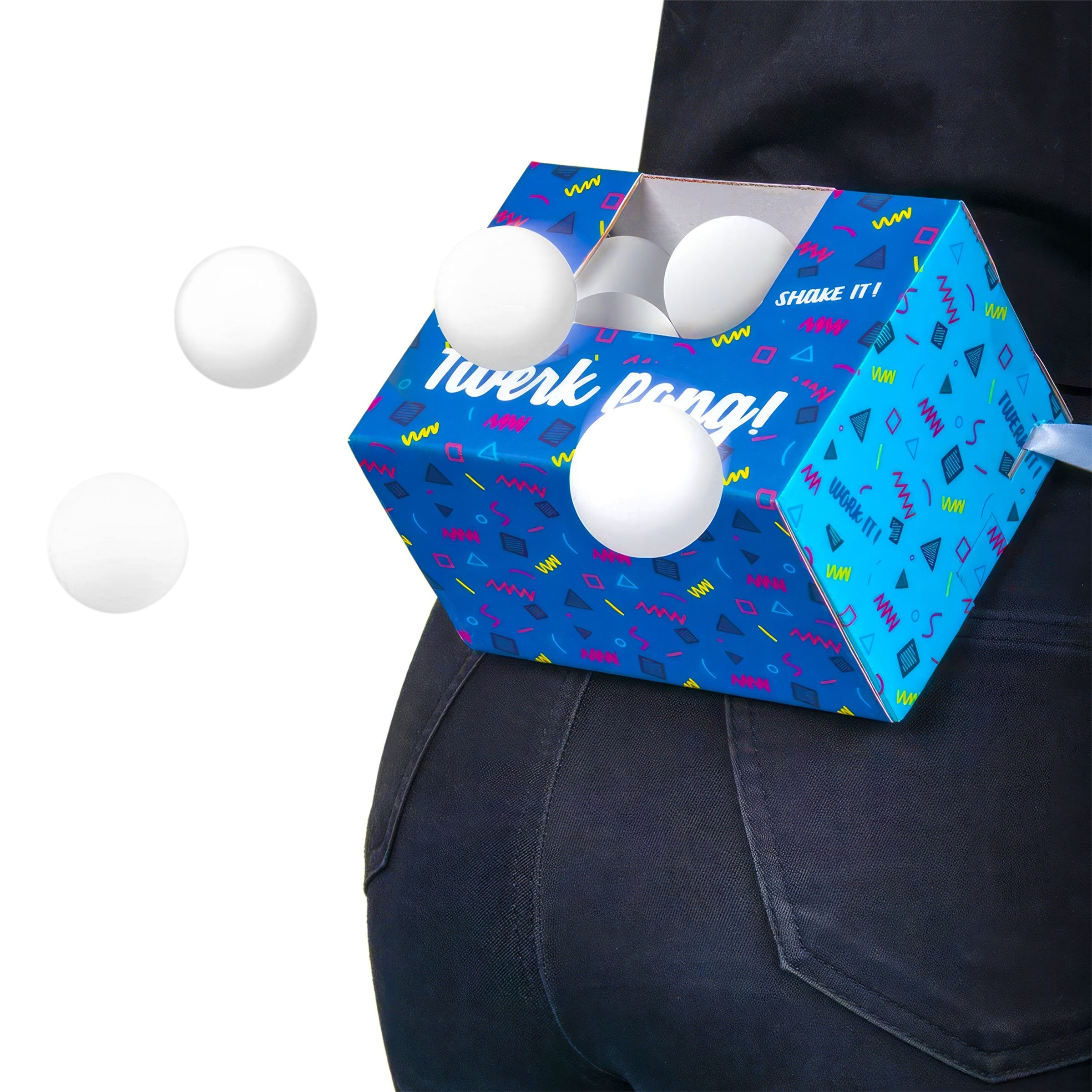 Twerk Pong sätter dina twerkskills på prov. Knyt lådorna runt midjan, fyll dem med pingisbollar och sedan är det bara att dansa loss som aldrig förr. Den som först har tömt sin låda på pingisbollar kan med stolthet utse sig själv till twerkexpert!