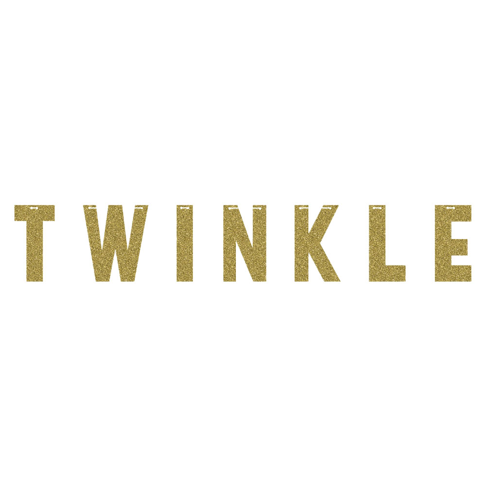 Twinkle Girlang Guld omfattar en guld-glittrig girlang i form av texten "Twinkle". Girlangen är tillverkad av papp och är ca 15 cm hög samt 167 cm lång.