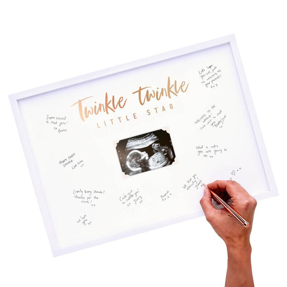 Twinkle Twinkle Little Star Baby Gästbok består av en vit ram med en vit bakgrund med en fin "Twinkle Twinkle Little Star" text i roséguld. Klistra in en egen bild på er bebis och låt sedan era gäster skriva en liten rad till er och bebisen.