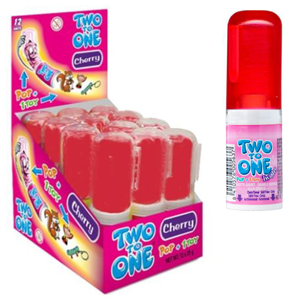 Two To One Godis med Leksak Körsbär omfattar ett hårt karamellgodis med smak av körsbär. Godiset kommer även med en liten leksak.