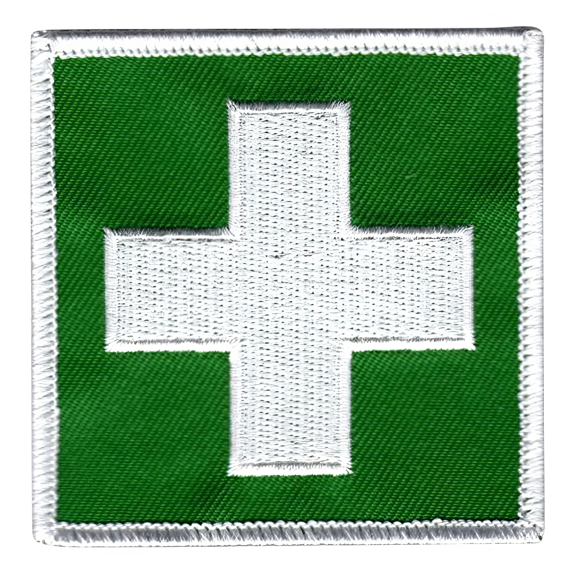 Tygmärke Sjukvård Första Hjälpen är ett märke som kan fästas på tyg. Märket är grönt med en vit ram. På märket finns också ett vitt kors.