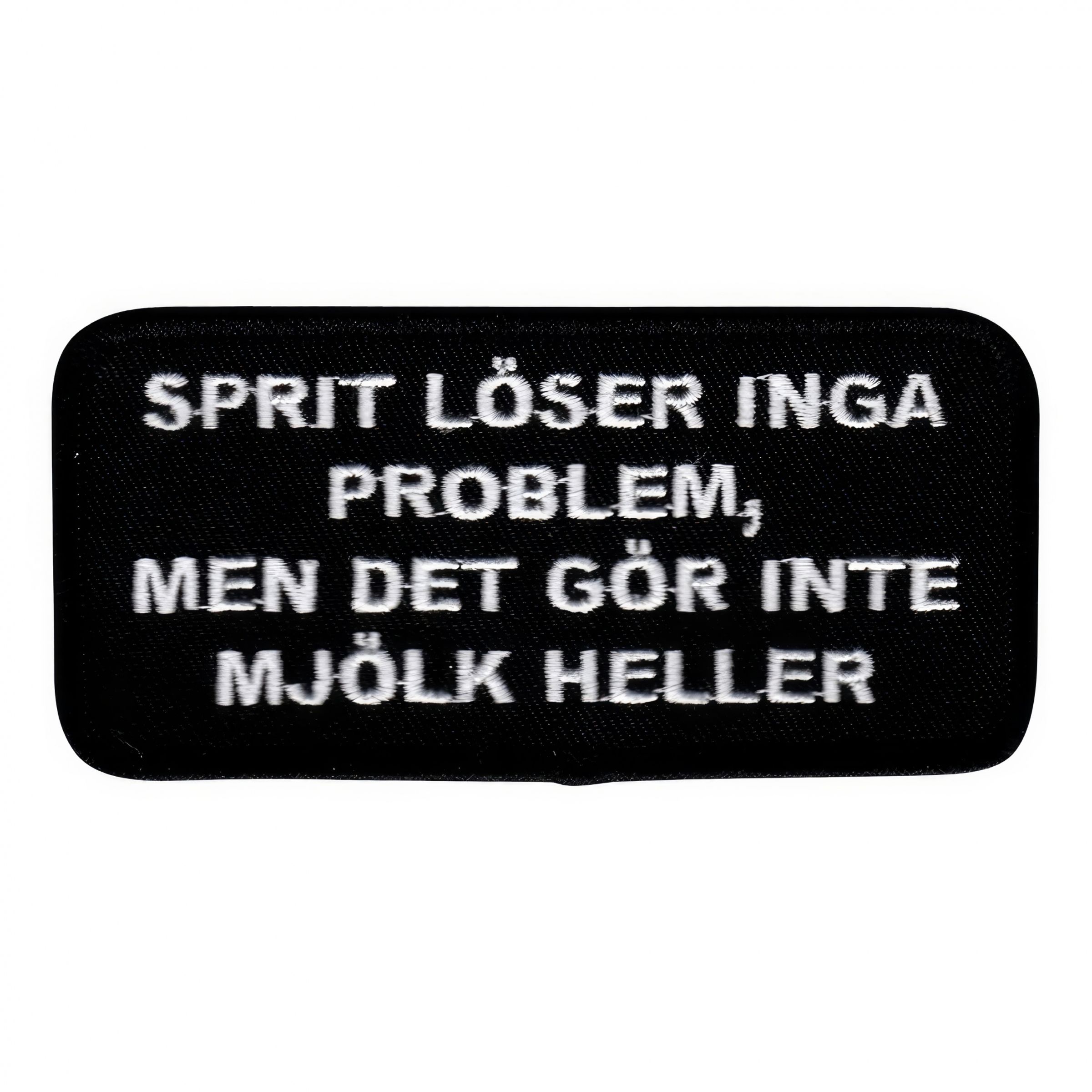 Tygmärke Sprit Löser Inga Problem är ett svart textilmärke med vit text. Texten på märket lyder "Sprit löser inga problem, men det gör inte mjölk heller". Du kan sätta fast märket på accessoarer och kläder av tyg.