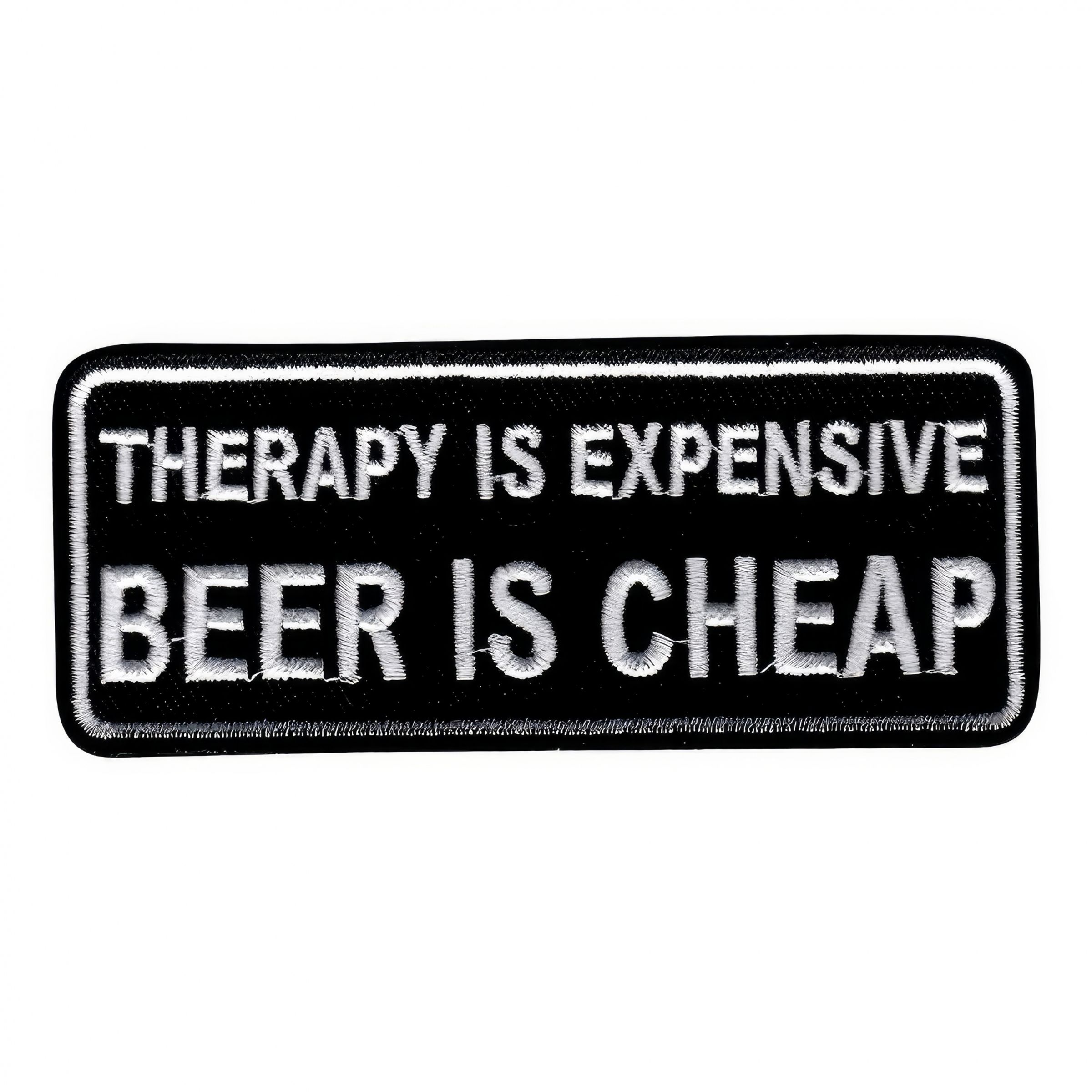Tygmärke Therapy Is Expensive Beer Is Cheap är ett märke som kan fästas på tyg. Märket är svart och på märket står det ”Therapy is expensive, beer is cheep” med vita bokstäver.