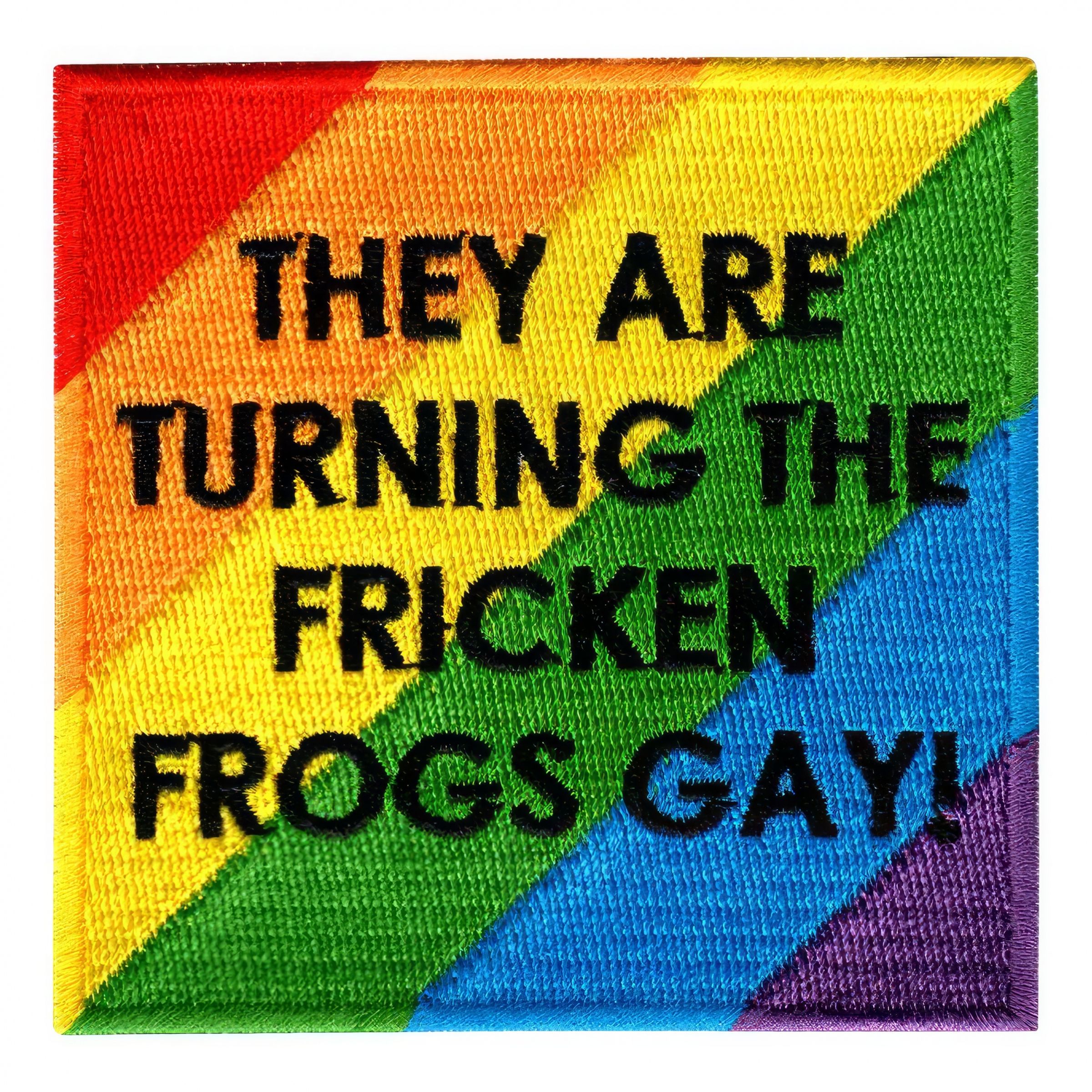 Tygmärke Turning The Frogs Gay är ett märke som kan fästas på tyg. Märket är fyrkantigt och är randigt i regnbågens alla färger. På märket står det ”They are turning the fricken frogs gay” med svarta bokstäver.