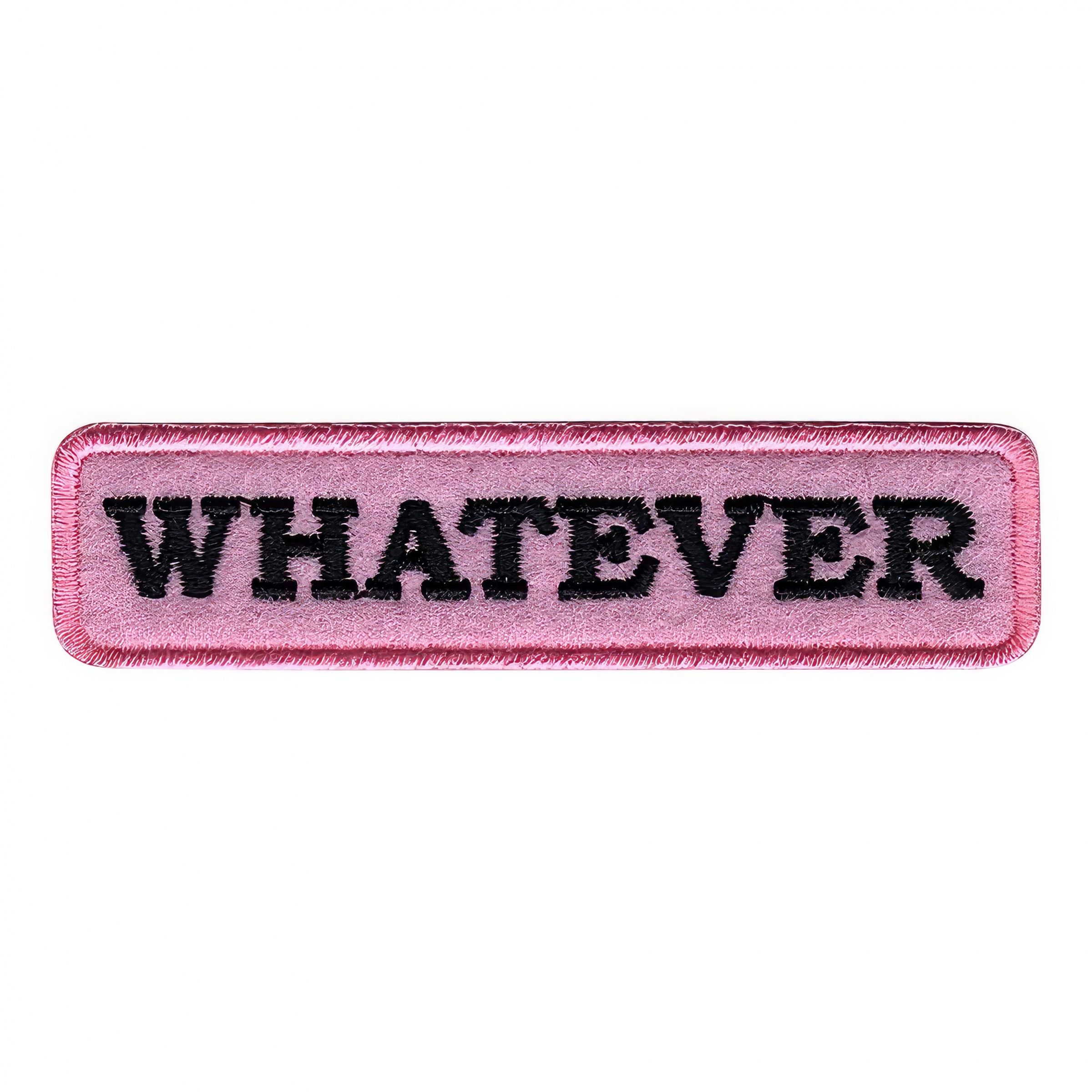 Tygmärke Whatever är ett märke som kan fästas på tyg. Märket är rosa och på märket står det ”Whatever” med svarta bokstäver.