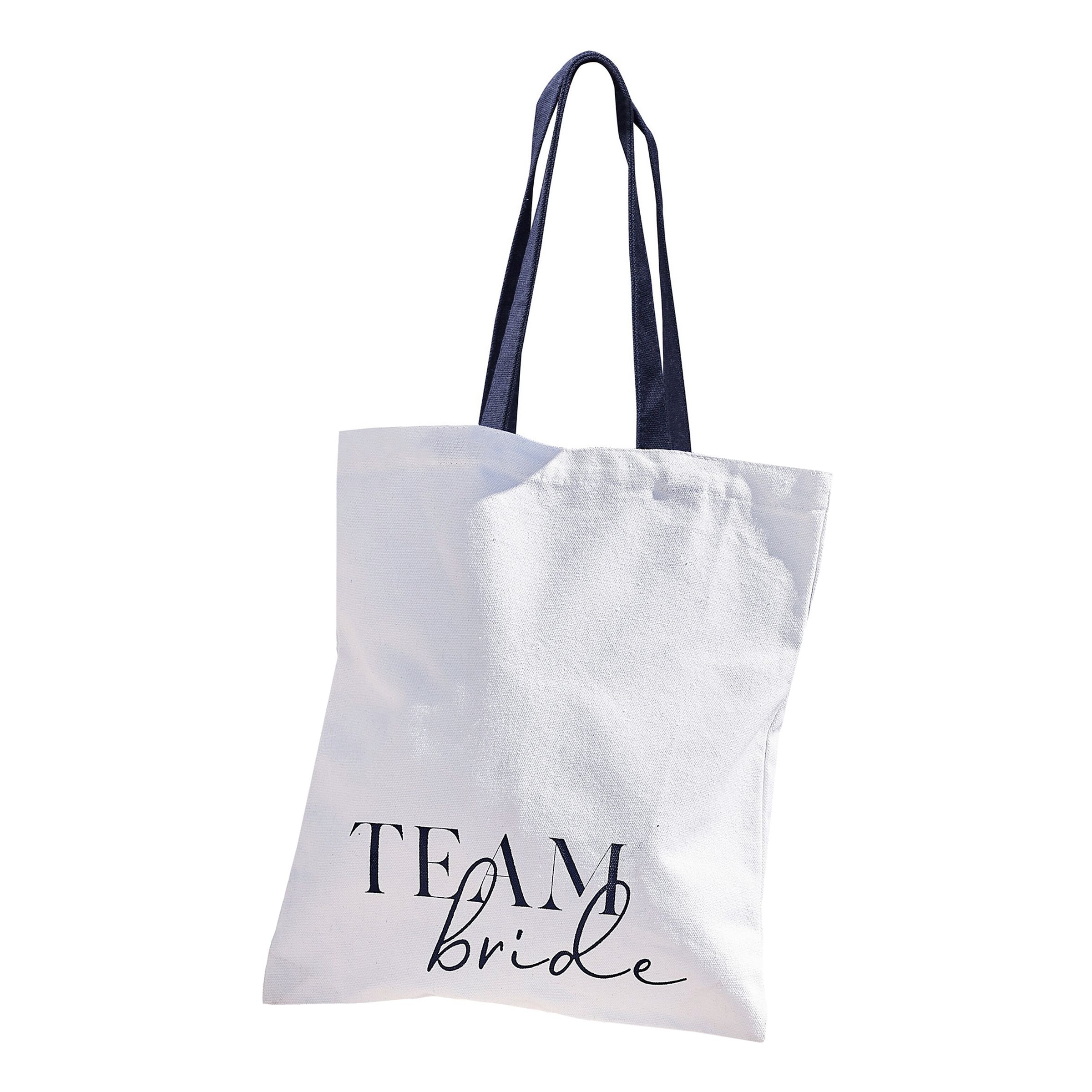 Tygpåse Bridesmaids mäter 36 x 31 cm och pryds av texten "Team Bride" En perfekt accessoar att slänga över axeln när det är dags för äventyr i möhippans tecken!