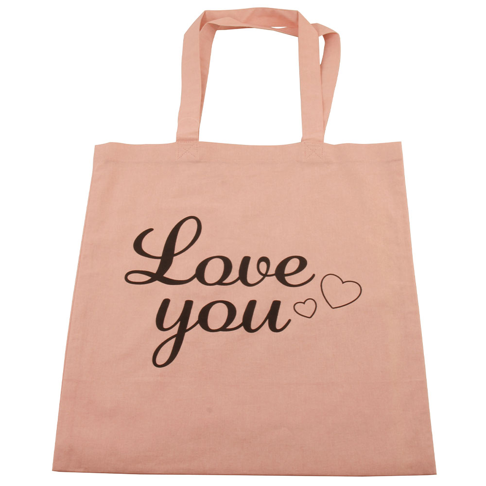 Tygpåse Love You Rosa omfattar en rosa tygkasse med texten "Love You" med snirkliga svarta bokstäver samt motiv av två hjärtan.