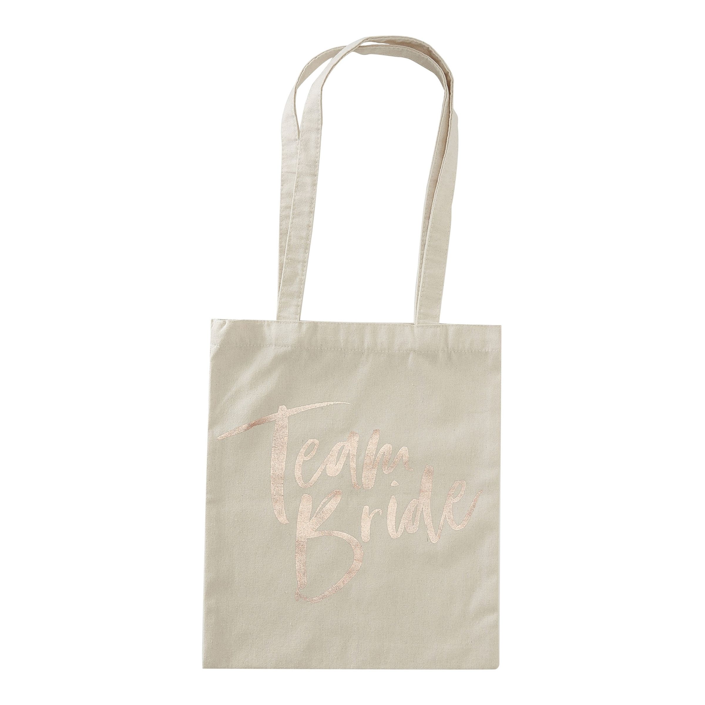 Tygpåse Team Bride är en tygväska i vitt med texten 'team bride' skrivet i roséguld. Perfekt till alla prylar man har med sig på bröllopet!