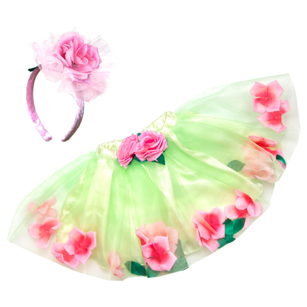 Tyllkjol och Diadem Flowerfairy omfattar en grön tyllkjol med gröna blad och rosa blommor på samt ett rosa sammets-diadem med stor rosa blomma på med gröna blad och rosa tyll. Kjolen och diademet är tillverkade av polyester och passar barn i åldern 3-7 år.
