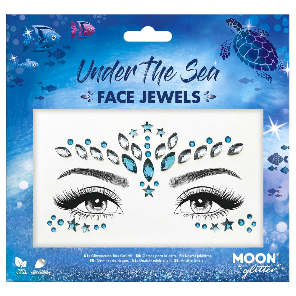 Under The Sea Ansiktssmycken omfattar tre stycken ansiktssmycken med diamanter i blått och silver. Diamanterna sitter på genomskinliga stickers med självhäftande baksida. Applicera ansiktssmycket genom att försiktigt dra av hela stickern från plasten och tryck det mot ren och torr hud.