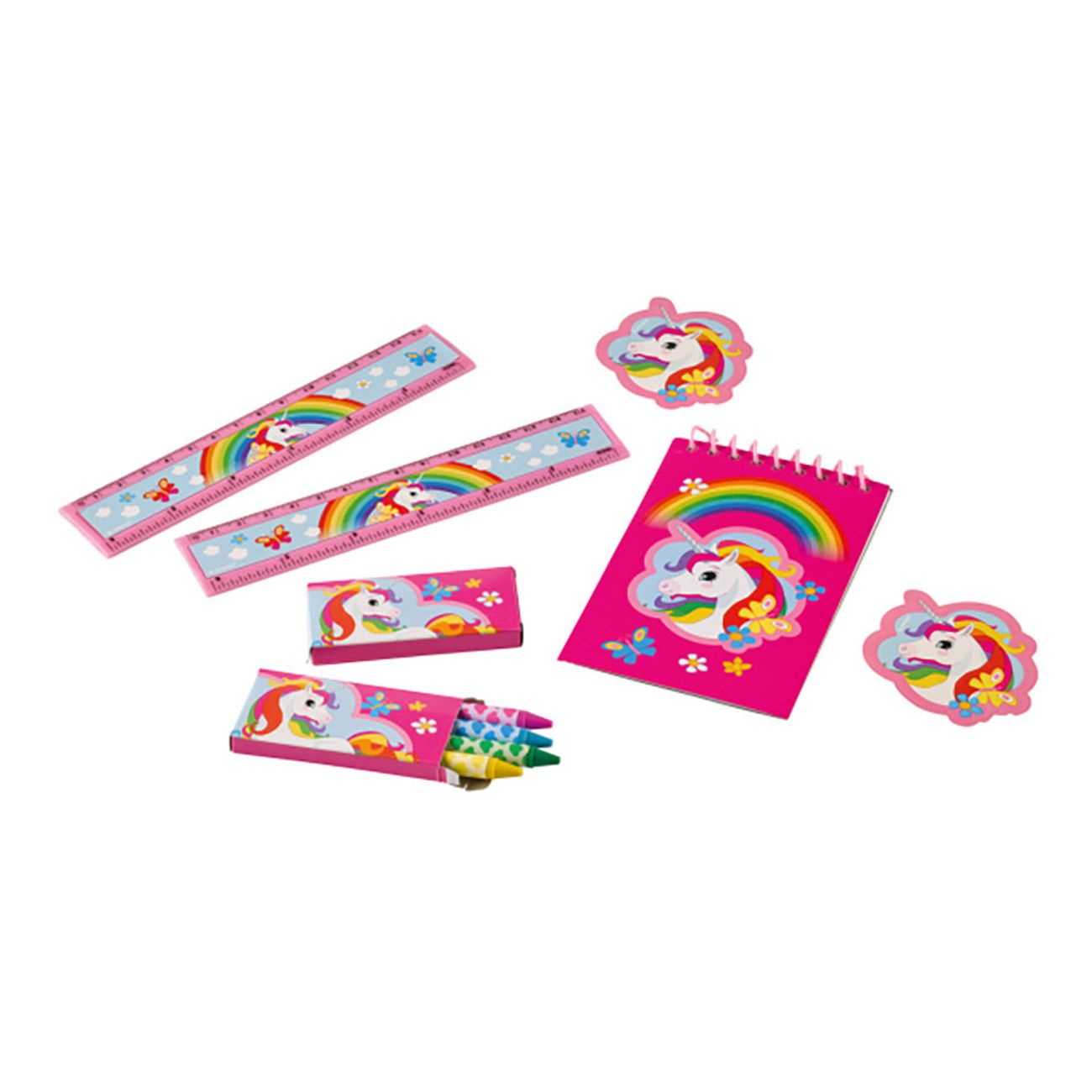 Unicorn Kalastillbehör innehåller 5 x förpackningar med kritor i 4 färger, 5 x anteckningsblock , 5 x linjaler och 5 x klistermärken.