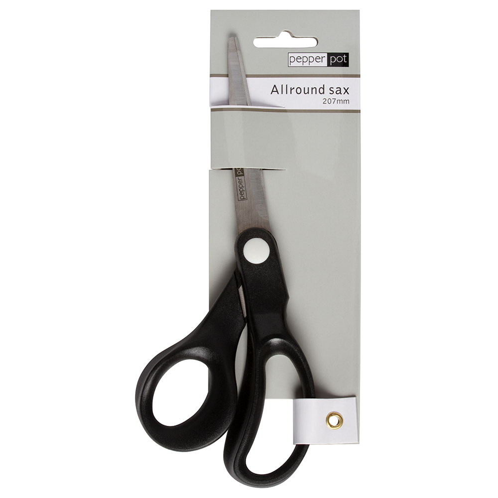 Universalsax Svart omfattar en sax för högerhänta i rostfritt stål med ett handtag i svart ABS-plast.