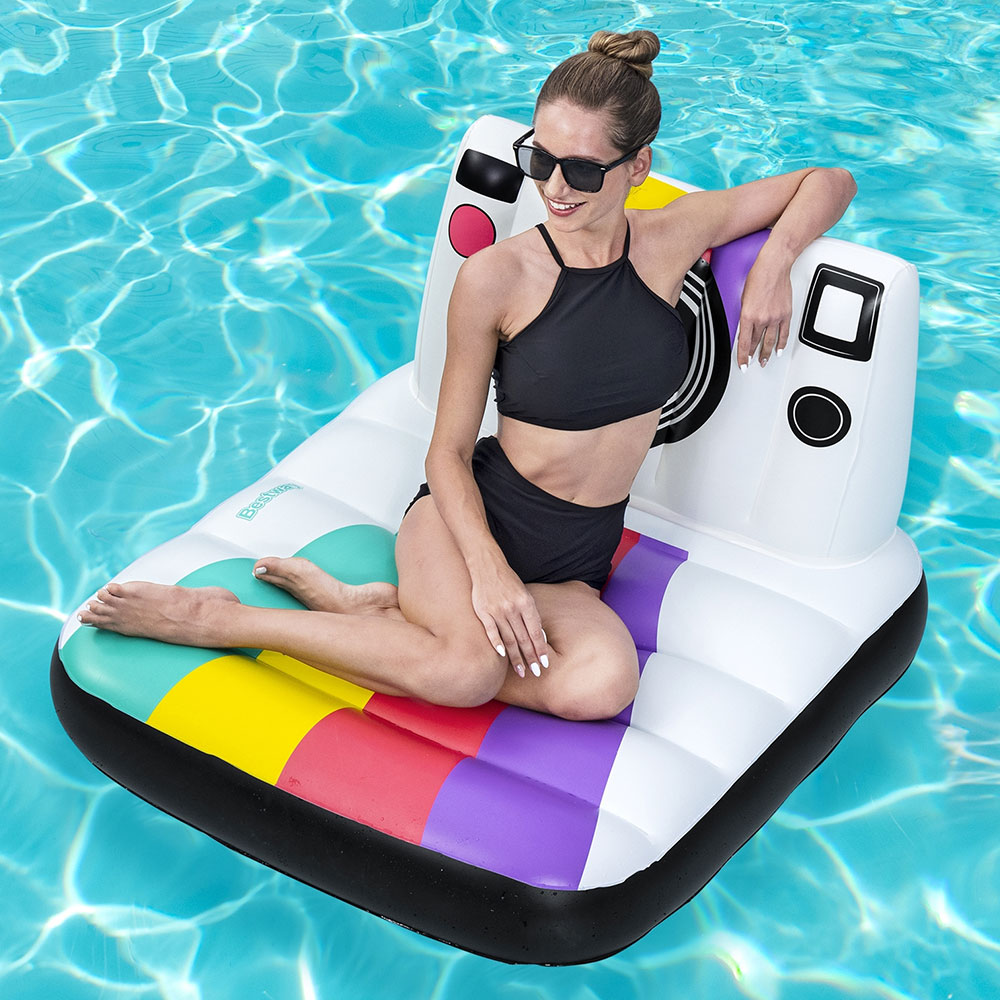 Uppblåsbar Badfåtölj Kamera är en färgglad uppblåsbar badfåtölj med en snygg kameradesign och ett bekvämt ryggstöd.