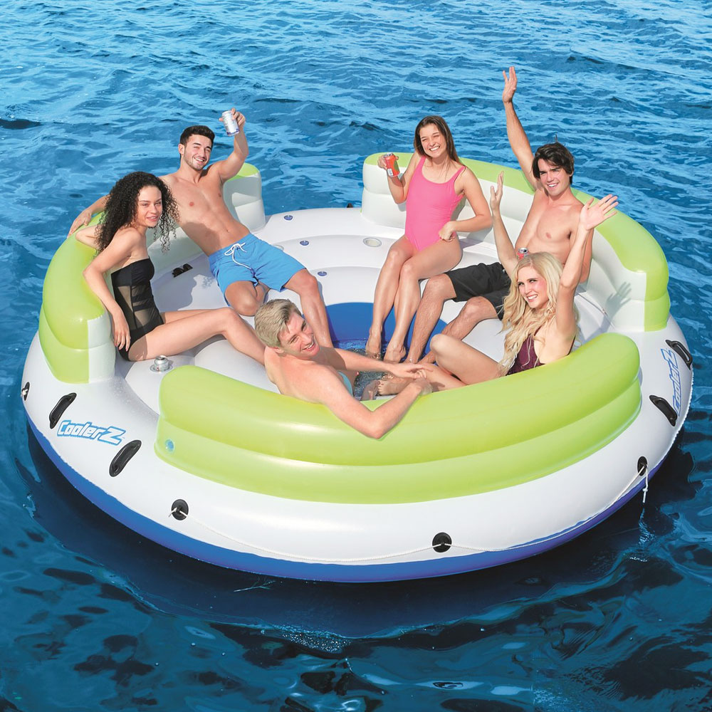 Uppblåsbar Badflotte Lazy Dayz omfattar en stor uppblåsbar badflotte av PVC-plast. Badflotten har breda ryggstöd och 6 stycken mugghållare. Flotten är ca 328 cm stor, har en maxvikt på 540 kg och rymmer 6 personer.