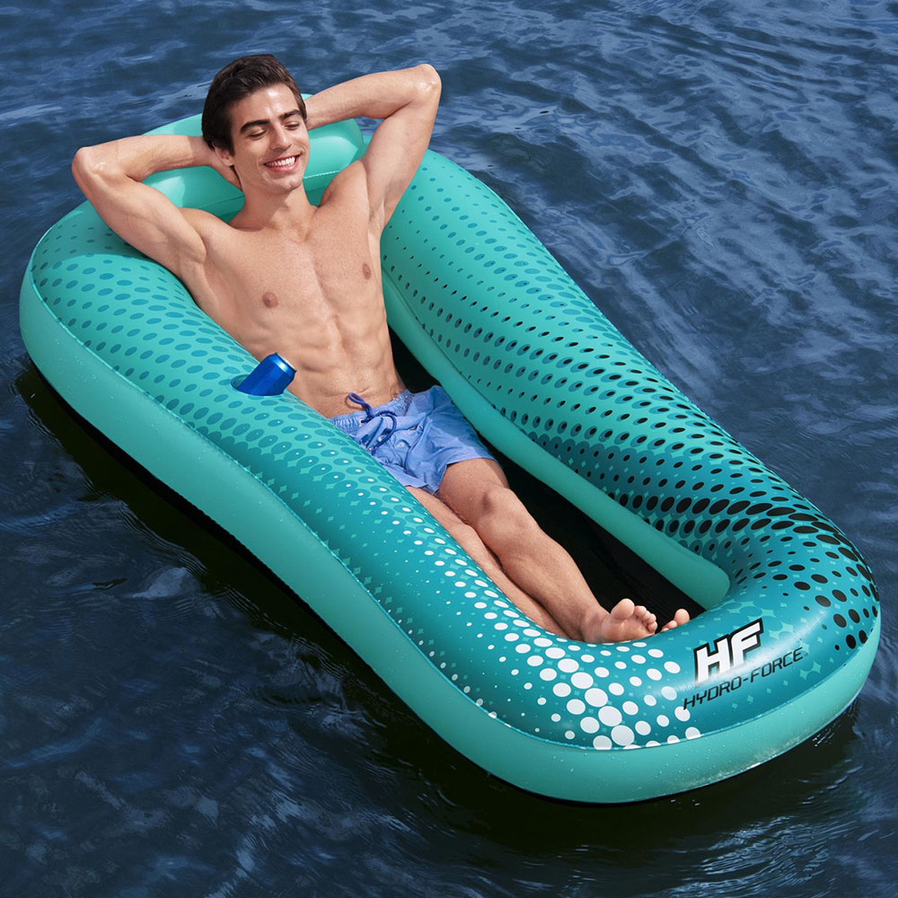 – Uppblåsbar badmadrass med nackstöd, nätbotten och mugghållare.