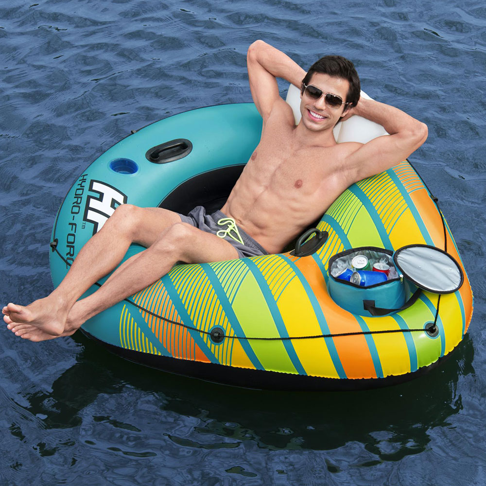 – Uppblåsbar badring med nätbotten, ryggstöd, mugghållare och avtagbar kylväska.