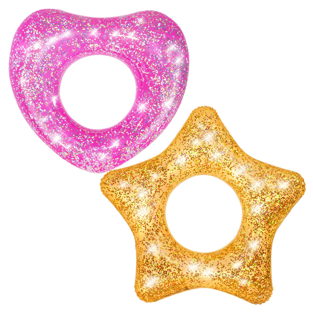 Uppblåsbar Badring Glitter omfattar en uppblåsbar badring med glitter. Badringen passar äldre barn och är tillverkad i slitstark PVC plast och är ca 91 cm i diameter. Finns i form av ett rosa glittrigt hjärta eller guldig glittrig stjärna, vilken du får blir en överraskning.