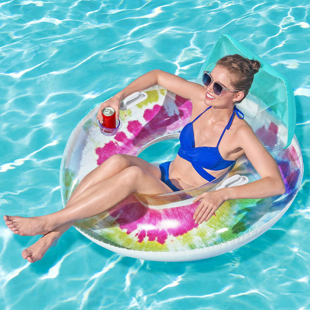 Koppla av i poolen med denna färgglada uppblåsbara badring för vuxna, komplett med handtag för säkerhet och ett skönt nackstöd. En mångsidig uppblåsbar flytleksak som även inkluderar en praktisk mugghållare. Perfekt som badleksak för vuxna.