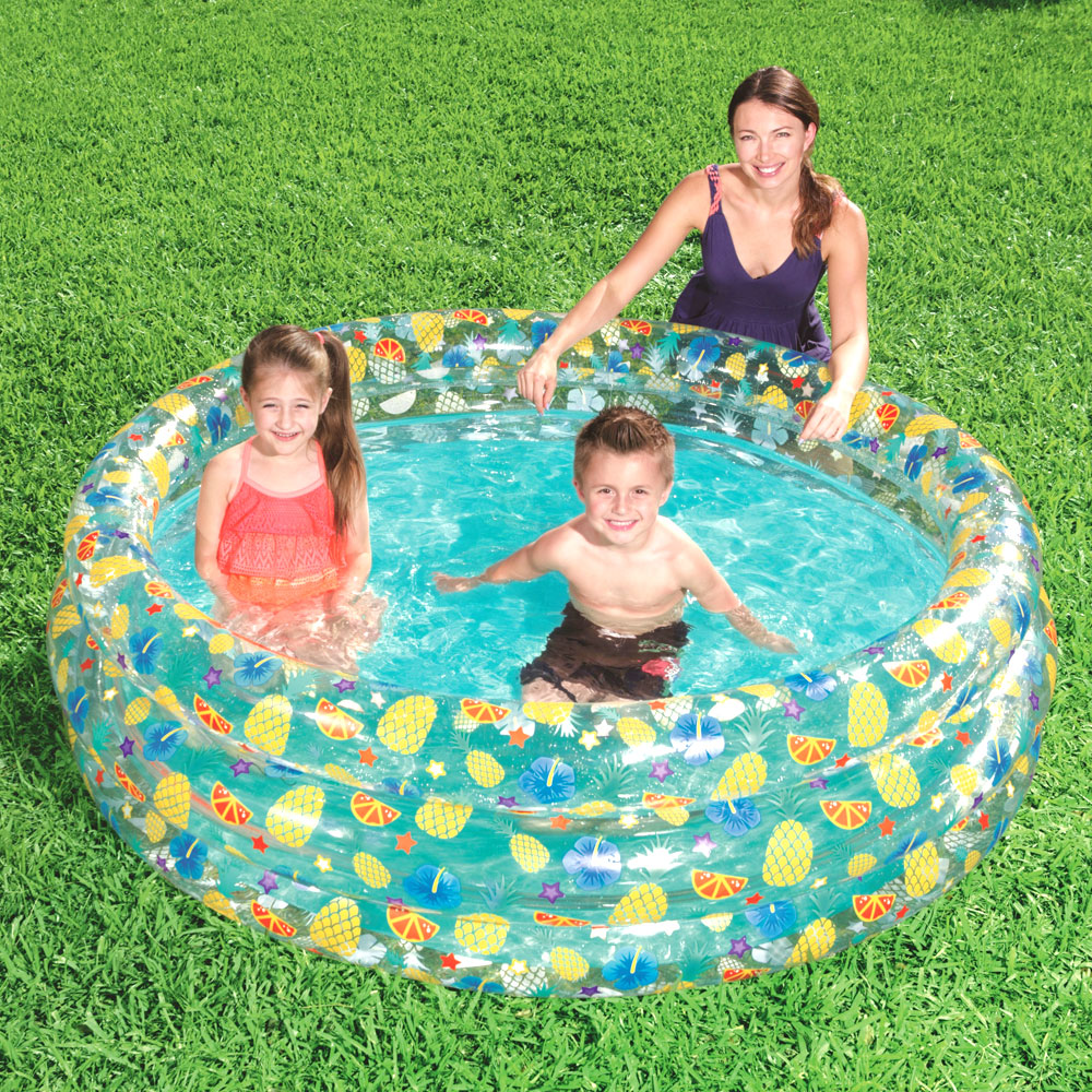 Uppblåsbar Barnpool Tropical omfattar en transparant barnpool med somriga motiv av blommor, frukter och stjärnor. Poolen är tillverkad av PVC-plast, rymmer 697 liter vatten och mäter ca 170 cm i diameter.